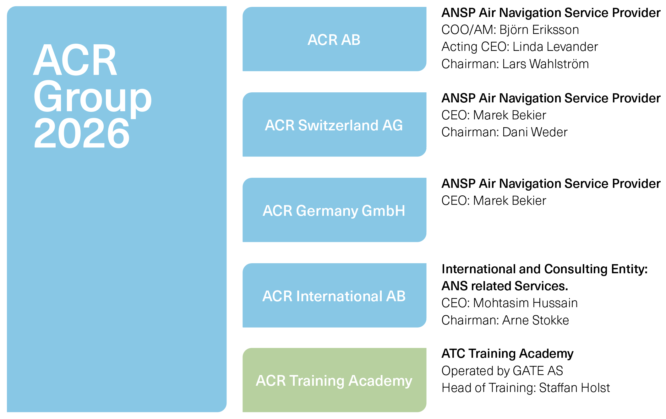 The ACR Group currently comprises several entities, including ACR AB, an Air Navigation Service Provider (ANSP) that operates a large number of aerodrome control towers in Sweden. The group's international division, ACR International AB, focuses on business in the Middle East. In addition, the ACR Group has established two ANSP start-ups: ACR Switzerland and ACR Flugsicherungsdienste GmbH. A vital component of the group's operations is the ACR Academy, an air traffic controller training facility located at Copenhagen Kastrup.